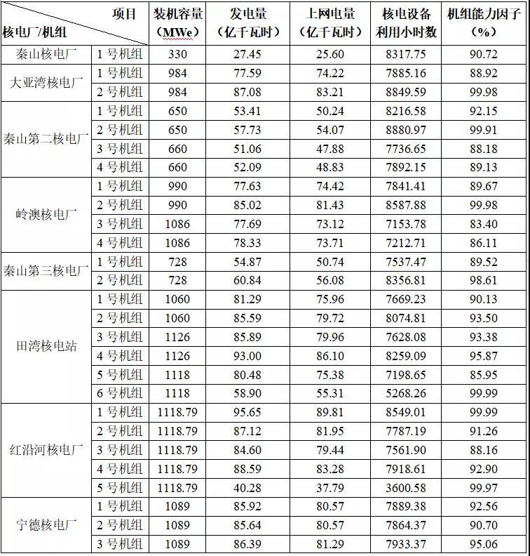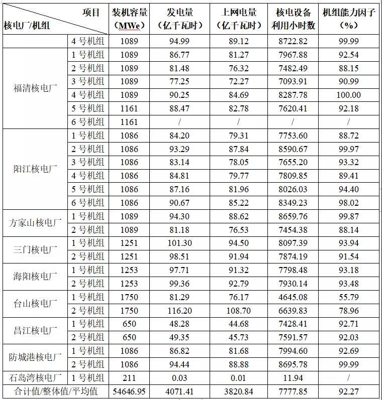 3) 本表最后一行“合計值/整體值/平均值”中,裝機(jī)容量、發(fā)電量、上網(wǎng)電量為各機(jī)組合計值,核電設(shè)備利用小時數(shù)為全部機(jī)組整體值,機(jī)組能力因子為全部機(jī)組的算數(shù)平均值。