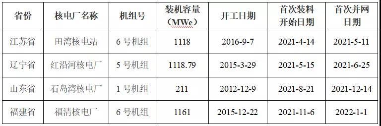 表1:2021年1-12月首次裝料的核電機(jī)組信息