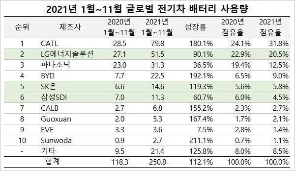 數(shù)據(jù)顯示,2021年1-11月,寧德時(shí)代以31.8%的市占率穩(wěn)坐全球第一把交椅;LG新能源位列其次,市占率為20.5%;三、四名分別是松下和比亞迪,CR4合計(jì)霸占了超70%的市場(chǎng)。