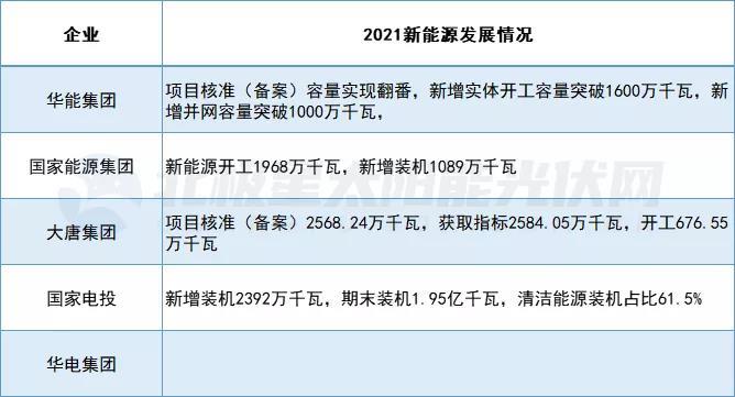 作為新能源領(lǐng)域的主力軍,五大發(fā)電集團2021年在新能源領(lǐng)域的成績單也異常亮眼,公開數(shù)據(jù)顯示:2021年,華能集團實現(xiàn)新能源新增并網(wǎng)超1000萬千瓦,實體開工超1600萬千瓦、國家能源集團新能源開工1968萬千瓦,新增裝機1089萬千瓦、大唐集團新能源項目核準(備案)2568.24萬千瓦,獲取指標2584.05萬千瓦......無一例外都創(chuàng)歷史最好水平。