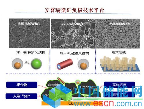 “硅負極材料目前面臨的最大挑戰(zhàn)是控制硅膨脹,業(yè)界想了很多辦法來克服硅膨脹。而崔屹博士發(fā)明了核 – 殼硅納米線結(jié)構(gòu),成功克服了控制硅膨脹。”安普瑞斯員工何向陽介紹,“形象的比喻就是做成雞蛋的形狀,在硅的外面包一層碳的“蛋清”,從而控制了膨脹?!保ㄈ缦聢D一)。圖中第一個圖的架構(gòu)是第一代產(chǎn)品,目前已經(jīng)上市,能量密度可以做到650WH/L,比目前市場上普通的電池能量密度高出約20%左右。第二個圖是馬上要量產(chǎn)的第二代產(chǎn)品結(jié)構(gòu),比第一代產(chǎn)品的能量密度能再提升10%-20%。但是,嚴格上來說,這兩種結(jié)構(gòu)還不是純硅負極,而是硅碳混合負極?!拔覀兡壳霸谘邪l(fā)的第三代產(chǎn)品才是純硅負極材料,它需要用全新的電芯生產(chǎn)線來生產(chǎn),設(shè)備都需要我們自己研發(fā),它會采用半導(dǎo)體晶園生長的方式來實現(xiàn)硅我負極材料的生成,這個能量密度將可達到 900WH/L,預(yù)計明年可以進行小批量試產(chǎn)?!彼忉?。“以目前的石墨碳負極電池的能量密度,達到600WH/L差不多已到極限,而采用硅負級能迅速讓電池能量密度提升?!焙蜗蜿柦忉?。(如下圖二)