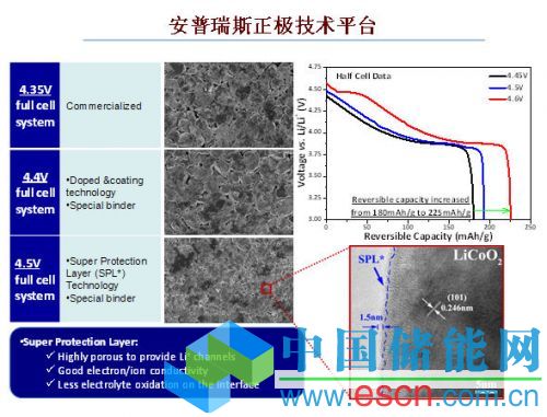 在正極技術(shù)方面,何向陽稱隨著手機的輸出電壓不斷提升,以讓用戶在電池耗盡被迫關(guān)機前能多用1-2%的電量,未來輸出電壓可能會提升到4.5V,這會要求正極有非常強的保護層材料,他們已可以做到。另外,主芯片廠商要求的電池突發(fā)電流也越來越大,比如MTK已從原來的2A,到4A(MT6592),未來的手機芯片還可能要求電池突發(fā)電流支持到7A,這對電化學平臺有新的要求,這也是他們的研究方向。如下圖。