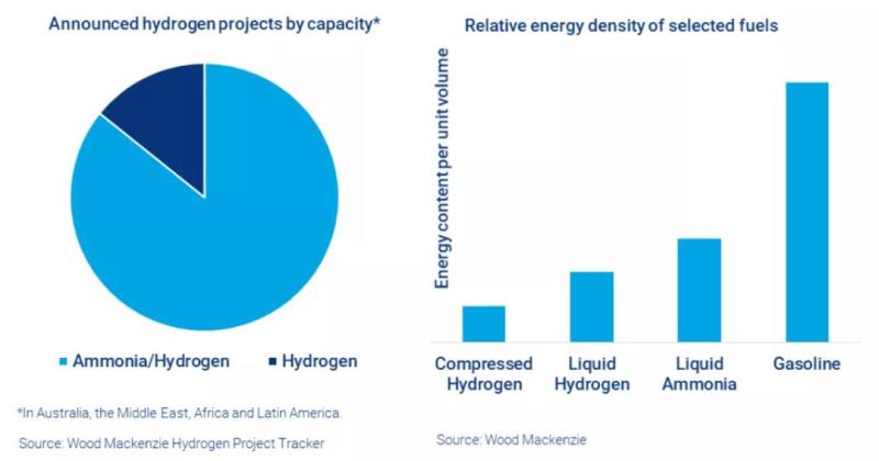 在相對較低的壓力條件下,使用液態(tài)氫載體(如氨NH3)的優(yōu)勢在于氨的能量密度分別是壓縮氫的3倍和液化氫的1.5倍。因此,使用氨遠距離輸出氫氣需要更少的船只即可運輸相同數(shù)量的氫能。