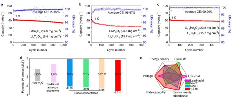 [1] Xu, J., Ji, X., Zhang, J. et al., Aqueous electrolyte design for super-stable 2.5 V LiMn2O4 || Li4Ti5O12 pouch cells. Nat Energy (2022). https://doi.org/10.1038/s41560-021-00977-5