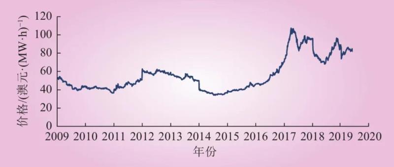 2009—2019年NSW基荷期貨結(jié)算價格變化情況如圖2所示??梢钥闯?,期貨價格基本上反映了2015年以后澳大利亞大量建設風光等新能源帶來的電價上漲趨勢。這表明澳大利亞的期貨市場有助于實現(xiàn)其中遠期價格發(fā)現(xiàn)的功能。