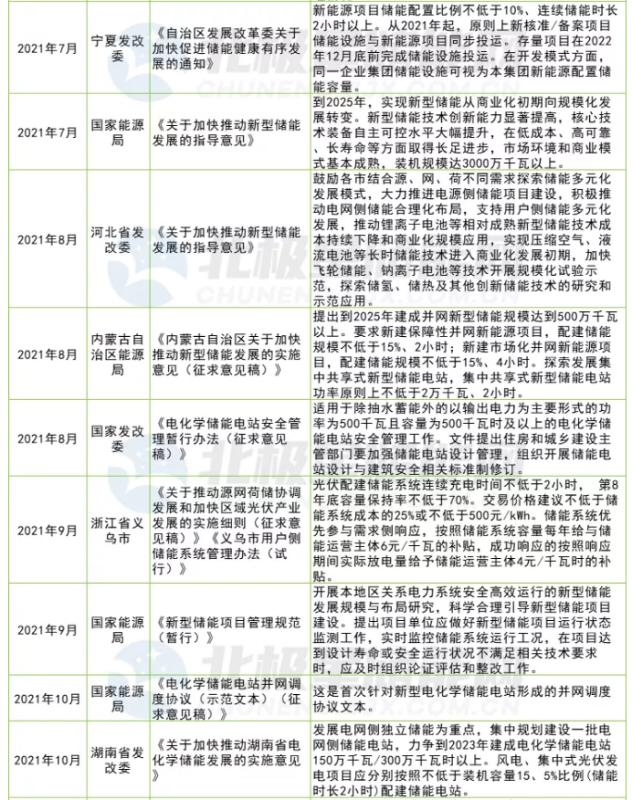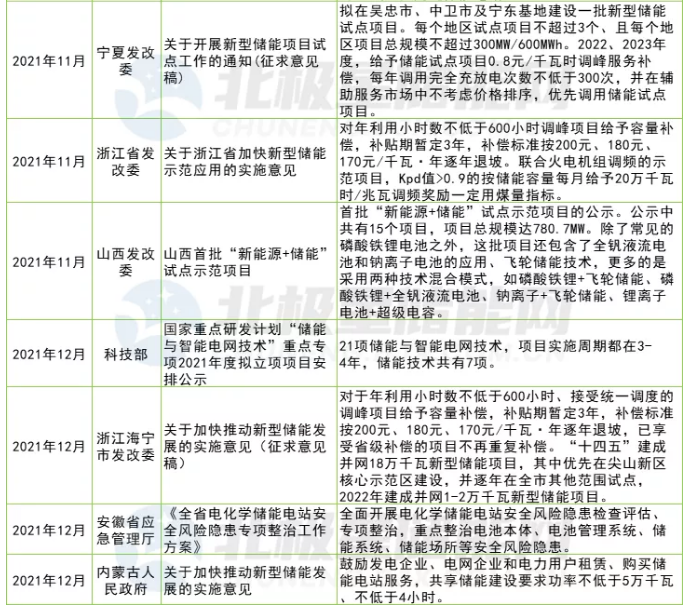 在雙碳戰(zhàn)略目標下,能源清潔化是核心。2021年以來各地都陸續(xù)發(fā)布文件啟動新能源“倍增計劃”,電源側多能互補、一體化、大基地模式成為新的發(fā)展趨勢。新能源發(fā)電的靠天吃飯?zhí)匦灾饾u成為其發(fā)展瓶頸,同時也是電源側儲能難以實現(xiàn)商業(yè)化的突破口。2021年全國各省市新能源配套儲能需求多達29項,各地26項儲能主題文件中大多提及了鼓勵以共享或租賃形式建設儲能節(jié)約成本,但真正最有利的推手當屬新版兩個細則。