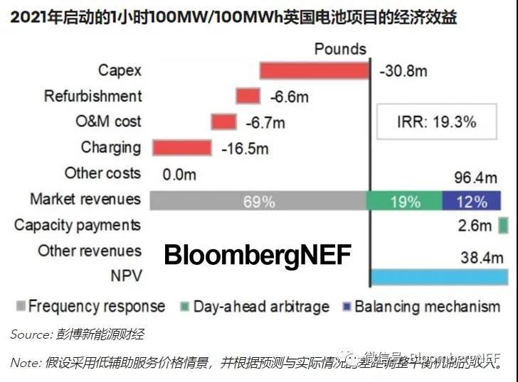 彭博新能源財(cái)經(jīng)的1小時(shí)電池項(xiàng)目模型2021年在頻率響應(yīng)上獲得的收入占比