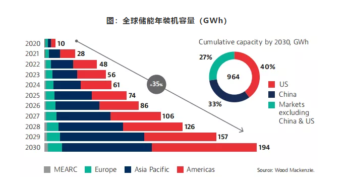 根據(jù)伍德·麥肯錫預(yù)測,2021年至2030年期間,全球?qū)⑿略鰞?chǔ)能容量346.2GW/964GWh,其中一半以上分布在美國和中國。