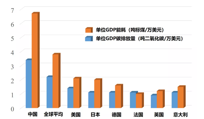 雖然我國(guó)歷史人均累計(jì)碳排放量遠(yuǎn)低于發(fā)達(dá)國(guó)家,但單位國(guó)內(nèi)生產(chǎn)總值(GDP)能耗與碳排放量遠(yuǎn)高于發(fā)達(dá)國(guó)家,如2020年我國(guó)單位GDP能耗為3.4噸標(biāo)準(zhǔn)煤/萬美元,單位GDP碳排放量為6.7噸二氧化碳/萬美元,均遠(yuǎn)高于全球平均水平及美國(guó)、日本、德國(guó)、法國(guó)、英國(guó)等發(fā)達(dá)國(guó)家(圖2)。