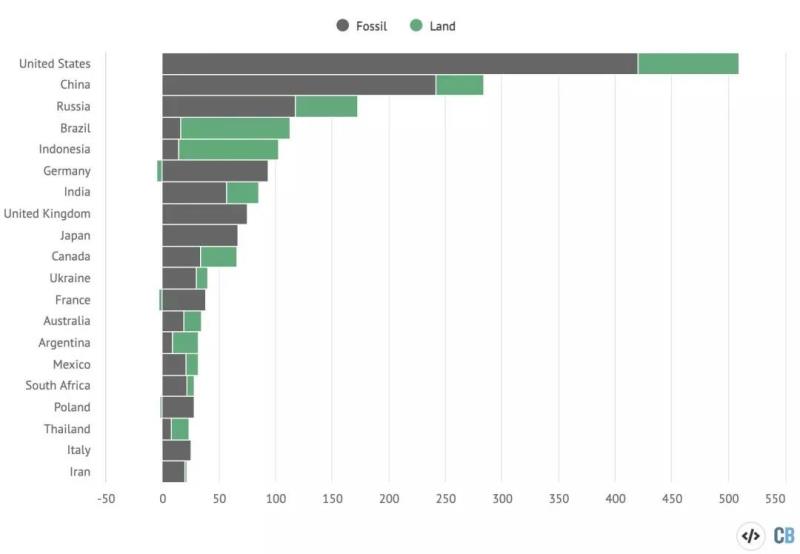 圖1 1850~2021年世界主要國(guó)家累計(jì)二氧化碳排放量(單位:十億噸,數(shù)據(jù)來源:Carbon Brief)