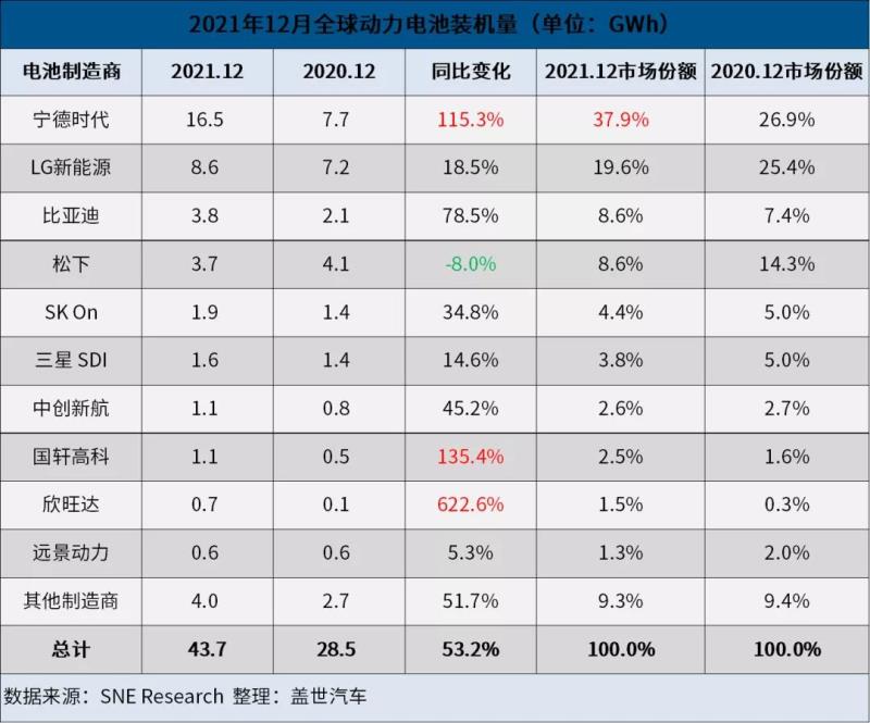 2021年12月,全球動力電池裝機量約為43.7 GWh,同比增長53.2%,連續(xù)第18個月增長。其中,寧德時代也延續(xù)了下半年的優(yōu)秀表現(xiàn),憑借16.5 GWh的裝機量和37.9%的市場份額再度領(lǐng)先;LG新能源仍居第二,市場份額下跌5.8個百分點;在第4名松下的電池裝機量同比下降8%的情況下,比亞迪進一步奪取其市場份額,并連續(xù)三月保持第3的排名不變。