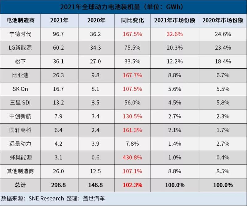 2021年全年,寧德時代、LG新能源和松下是電池裝機量年度榜單排名前3的電池制造商。寧德時代裝機量達96.7 GWh,市場份額近三分之一;但LG新能源和松下的市場份額分別下跌了3.1個百分點和6.2個百分點。第4名比亞迪的裝機量同比增加16.5 GWh,幾乎相當于第5名SK On的年裝機量,也遠超第6名三星SDI的年裝機量。