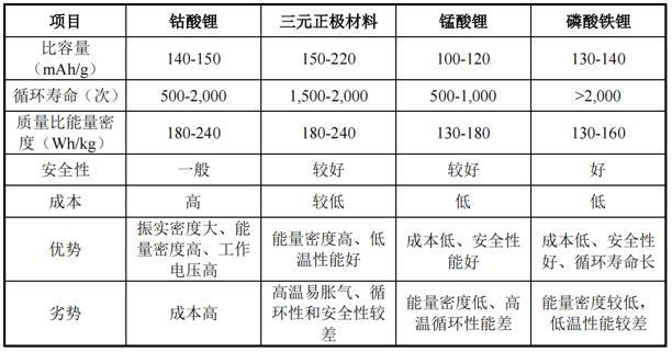 盟固利的主營業(yè)務(wù)為鋰電池正極材料的研發(fā)、生產(chǎn)和銷售,主要產(chǎn)品為鈷酸鋰和三元材料。鋰電池按照正極材料的體系進行劃分,通??蓜澐譃殁捤徜嚒㈠i酸鋰、磷酸鐵鋰、三元材料等多種技術(shù)路線,不同的正極材料有著不同的優(yōu)缺點和應(yīng)用領(lǐng)域,其中消費領(lǐng)域電池技術(shù)路線以鈷酸鋰電池為主,相對穩(wěn)定。