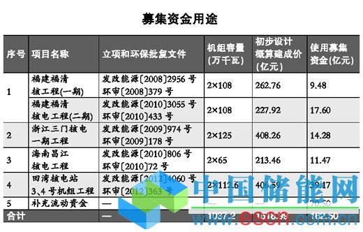 5月4日晚間,中國核能電力股份有限公司(以下簡稱“中國核電”) “首次公開發(fā)行股票招股說明書”出現(xiàn)在證監(jiān)會網(wǎng)站,其中披露的信息備受外界關(guān)注。招股書顯示,中國核電擬公開發(fā)行不超過36.51億股,約占發(fā)行后公司總股本的25%,擬融資總計162.51億元,將用于福清核電、三門核電、昌江核電及田灣核電項目在內(nèi)的10臺在建核電機組投資及補充流動資金。