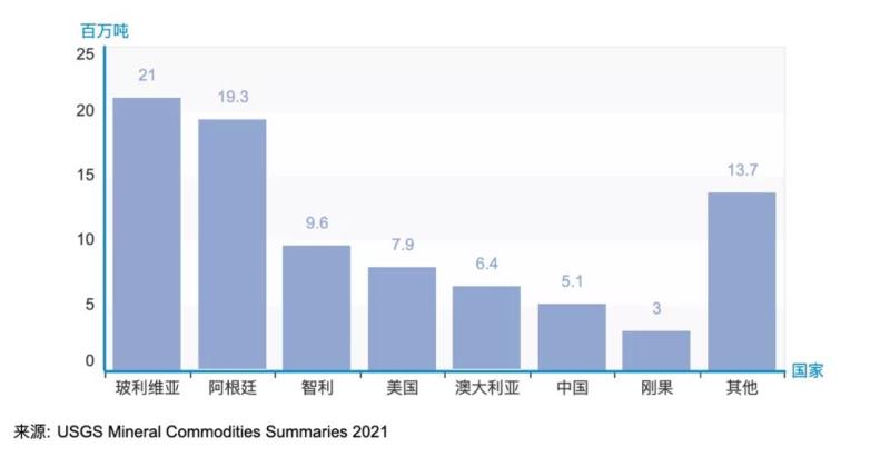 隨著低碳轉(zhuǎn)型技術(shù)的普及,對于鋰資源的需求不斷提升。據(jù)美國地質(zhì)勘探局(USGS)2021年礦場資源總結(jié)的報告顯示,全球已查明的鋰資源總量約為8600萬噸[5],具體分布可見下圖世界鋰資源儲量前幾位的國家依次是玻利維亞、阿根廷、智利、美國、澳大利亞和中國[6]。