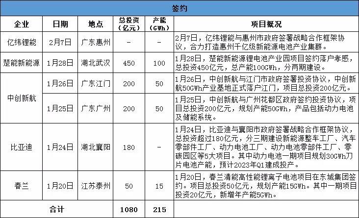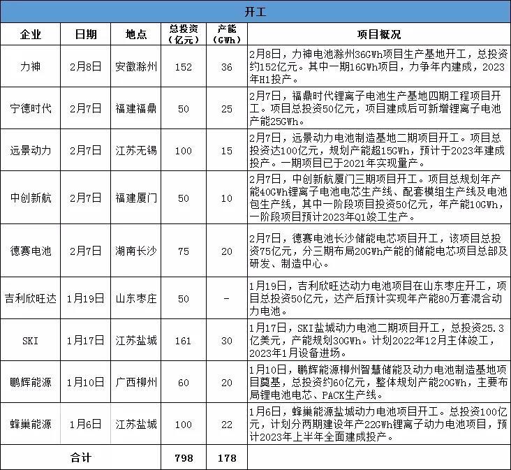 高工鋰電統(tǒng)計(jì)顯示,春節(jié)前后,涉及動力及儲能電池開工的項(xiàng)目達(dá)9個,總投資超798億元,產(chǎn)能規(guī)劃超176GWh;簽約投資動力電池項(xiàng)目6個,總投資超1080億元,產(chǎn)能規(guī)劃超215GWh。