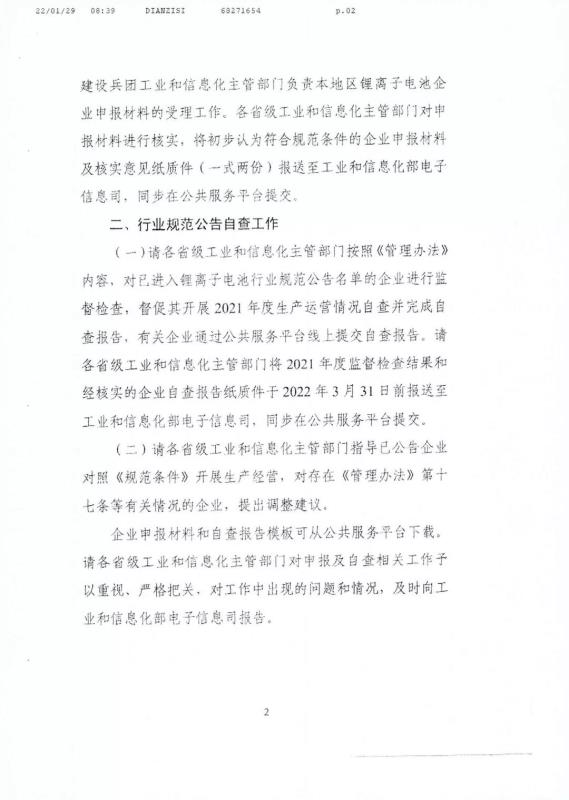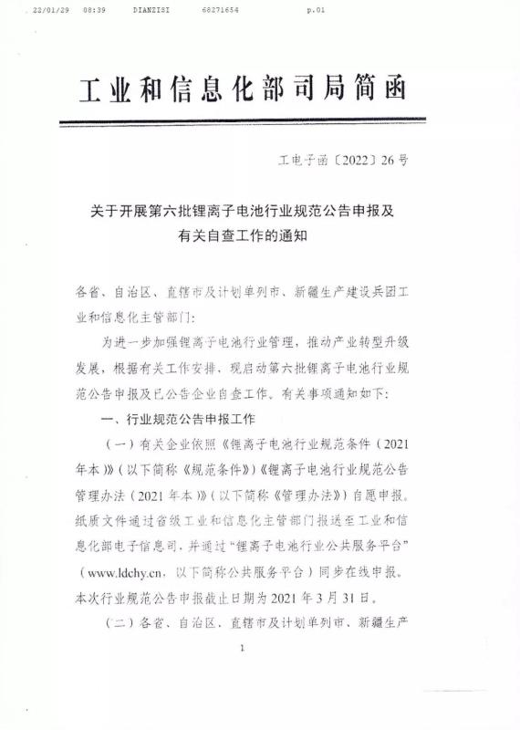 中國儲能網(wǎng)訊:1月27日,工信部發(fā)布關(guān)于開展第六批鋰離子電池行業(yè)規(guī)范公告申報及有關(guān)自查工作的通知。通知中明確提出本地區(qū)符合條件的鋰離子電池行業(yè)(含動力型電池、儲能型電池、消費(fèi)型電池、正極材料、負(fù)極材料、隔膜、電解液)企業(yè)自愿申報。其中自查內(nèi)容,包含企業(yè)產(chǎn)能、單體和系統(tǒng)能量密度、循環(huán)壽命容量保持率等。