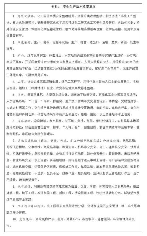 深化專項整治。深入推進危險化學品、礦山、消防、交通運輸、建筑施工、民爆、特種設(shè)備、大型商業(yè)綜合體等重點行業(yè)領(lǐng)域安全整治,解決影響制約安全生產(chǎn)的薄弱環(huán)節(jié)和突出問題,督促企業(yè)嚴格安全管理、加大安全投入、落實風險管控措施。結(jié)合深化供給側(cè)結(jié)構(gòu)性改革,推動安全基礎(chǔ)薄弱、安全保障能力低下且整改后仍不達標的企業(yè)退出市場。統(tǒng)籌考慮危險化學品企業(yè)搬遷和項目建設(shè)審批,優(yōu)先保障符合條件企業(yè)的搬遷用地。持續(xù)推進企業(yè)安全生產(chǎn)標準化建設(shè),實現(xiàn)安全管理、操作行為、設(shè)施設(shè)備和作業(yè)環(huán)境規(guī)范化。推動淘汰落后技術(shù)、工藝、材料和設(shè)備,加大重點設(shè)施設(shè)備、儀器儀表檢驗檢測力度。推動各類金融機構(gòu)出臺優(yōu)惠貸款等金融類產(chǎn)品,大力推廣新技術(shù)、新工藝、新材料和新裝備,實施智能化礦山、智能化工廠、數(shù)字化車間改造,開展智能化作業(yè)和危險崗位機器人替代示范。強化危險廢物全過程監(jiān)管,動態(tài)修訂《國家危險廢物名錄》,修訂危險廢物鑒別、貯存以及水泥窯協(xié)同處置污染控制等標準,制定完善危險廢物重點監(jiān)管單位清單。建立廢棄危險化學品等危險廢物監(jiān)管協(xié)作和聯(lián)合執(zhí)法工作機制,加強危險廢物監(jiān)管能力與應(yīng)急處置技術(shù)支持能力建設(shè)。