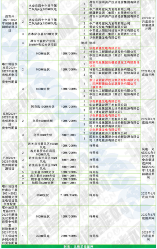 截至目前,新疆各地已啟動(dòng)2022年度新能源發(fā)電竟配項(xiàng)目,其中新疆建設(shè)兵團(tuán)招標(biāo)文件只提出配置儲(chǔ)能、未要求配置比例,其余基本要求按照新能源裝機(jī)量10%~15%配置儲(chǔ)能,儲(chǔ)能時(shí)長方面阿克蘇地區(qū)要求最高、為3小時(shí),而其他地區(qū)均要求2小時(shí)。若以最低配置比例10%/2h計(jì)算,則新疆2022年新增的風(fēng)電光伏項(xiàng)目配置儲(chǔ)能裝機(jī)量將超過658.5MW/1407MWh,這些儲(chǔ)能項(xiàng)目除了巴州和新疆建設(shè)兵團(tuán)部分項(xiàng)目要求2023年前并網(wǎng)外,其余大多要求2022年6月底或12月底前并網(wǎng),由此可見,新疆2022年底前將新增儲(chǔ)能項(xiàng)目將超過488.5MW/1067MWh。