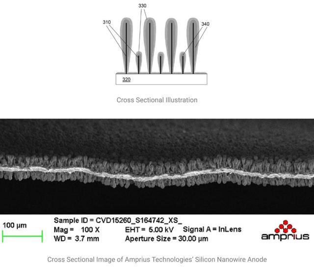 上圖:硅納米線電極比典型的石墨晶格電極可以儲(chǔ)存更多的鋰,Amprius公司表示,硅納米線電極的使用壽命足以與當(dāng)前的技術(shù)相媲美。