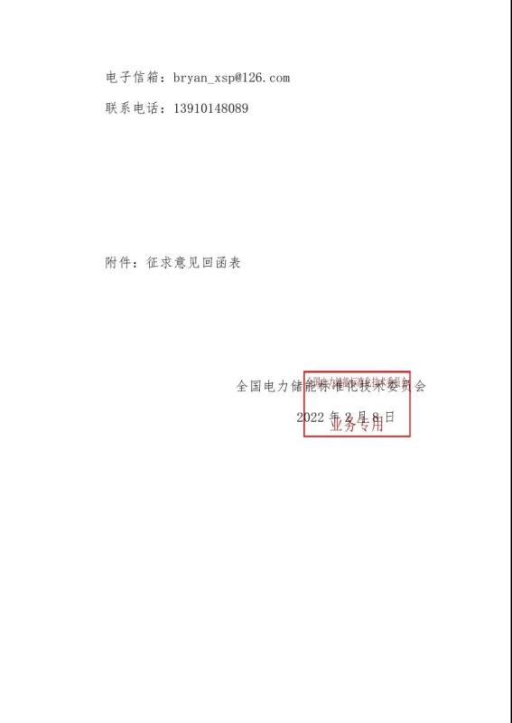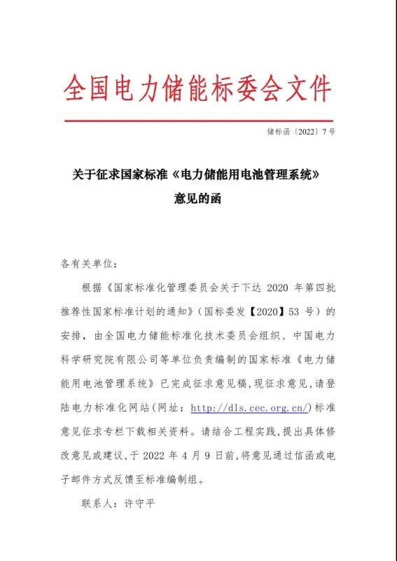 關(guān)于征求國(guó)家標(biāo)準(zhǔn)《電力儲(chǔ)能用電池管理系統(tǒng)》意見的函