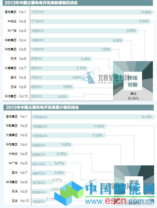 2013 年,風(fēng)電新增裝機排名中,國電集團繼續(xù)保持其領(lǐng)先地位,中電投、中廣核緊隨其后,在風(fēng)電累計裝機中,僅國電集團累計裝機容量超過15000MW,達到17508MW,占全國累計裝機總量的19.2%,其次分別為華能和大唐集團,裝機容量軍突破10000MW,所占市場份額分別為11.7%和11.6%。前十名風(fēng)電開發(fā)商的市場份額進一步提升,三峽和天潤近幾年新增裝機增速較快,替代京能和新天綠色能源進入前10名。