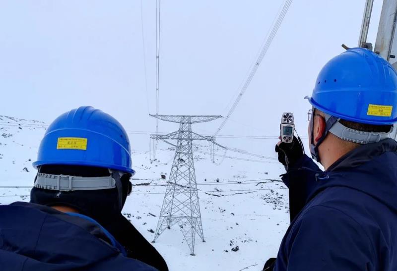 南方電網(wǎng)超高壓公司昆明局防冰特巡人員在昆柳龍直流157號塔觀測鐵塔覆冰情況、監(jiān)測現(xiàn)場風(fēng)速和溫濕度、測量模擬導(dǎo)線覆冰厚度。(楊兵 攝)
