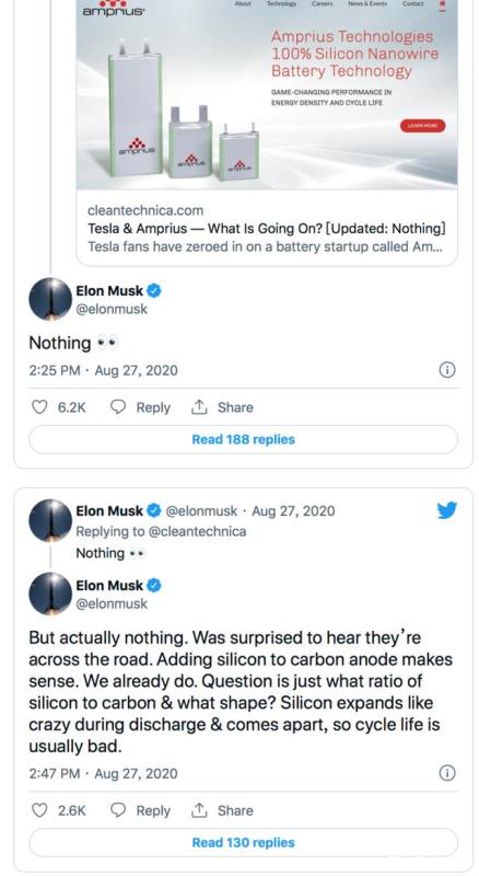 馬斯克更是在推特上直言,特斯拉與Amprius之間什么都沒發(fā)生。