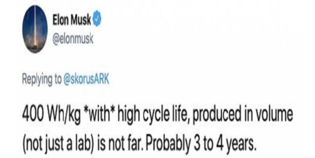 在2020年8月的特斯拉電池日之前,馬斯克在推特上表示特斯拉會在3-4年內批量生產壽命更長、而且能量密度提高50%也就是達到400wh/kg的電池,當時Model 3使用的松下 2170 電池電芯能量密度為260wh/kg。