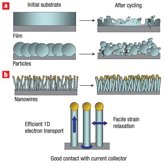 2007年,時為斯坦福材料科學與工程系助理教授的崔屹在Nature Nanotechnology上發(fā)布了一篇題為《使用硅納米線的高性能鋰電池負極(High-performance lithium battery anodes using silicon nanowires)》的論文,詳細闡釋了硅納米線技術在鋰電池中的應用。