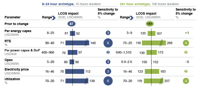 充放電效率是平準(zhǔn)化成本(LCOS)計(jì)算中的一個影響變量(具有一對一的相關(guān)性),因?yàn)樗绊懗潆姾头烹娨?;然而,與能源資本支出相比,它對長時儲能競爭力和價值的影響是有限的。從平準(zhǔn)化成本(LCOS)敏感性的角度來看,儲能容量資本支出將直接影響系統(tǒng)的設(shè)計(jì)儲能容量及其利用率。其充放電效率的改進(jìn)通常受到技術(shù)限制的影響。