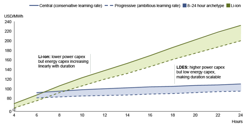 (2)與鋰離子電池儲能系統(tǒng)相比,長時儲能系統(tǒng)可在6小時以上的持續(xù)時間內(nèi)具有平準(zhǔn)化成本(LCOS)競爭力,在9小時以上具有明顯優(yōu)勢