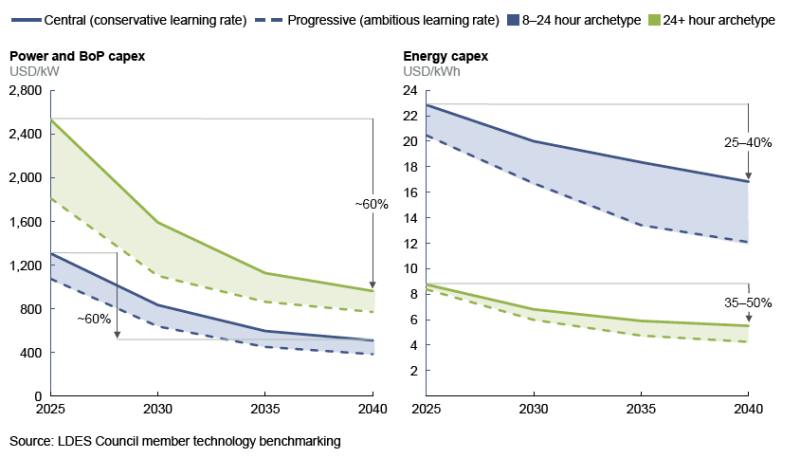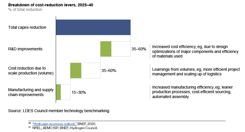 長時儲能系統(tǒng)資本支出的預(yù)測(到2040年減少55%至60%的成本)與公用事業(yè)規(guī)模鋰離子電池儲能系統(tǒng)(降低約70%)和氫能設(shè)施(降低約50%)報告的預(yù)期相當(dāng)。