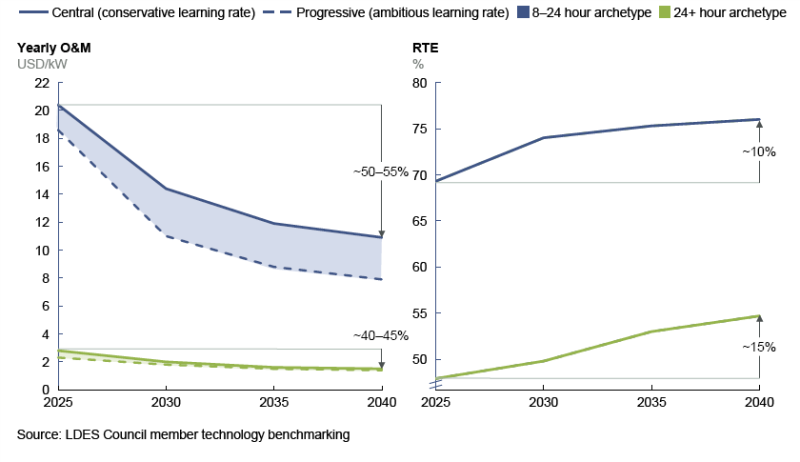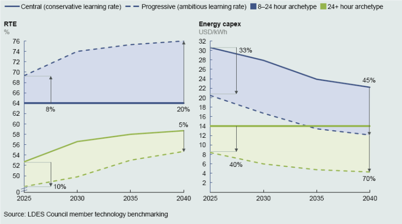 長時儲能的競爭力主要由儲能容量的成本驅(qū)動,預(yù)計(jì)其成本將下降60%。這些長時儲能技術(shù)的充放電往返效率(RTE)預(yù)計(jì)也將提高10%至15%。
