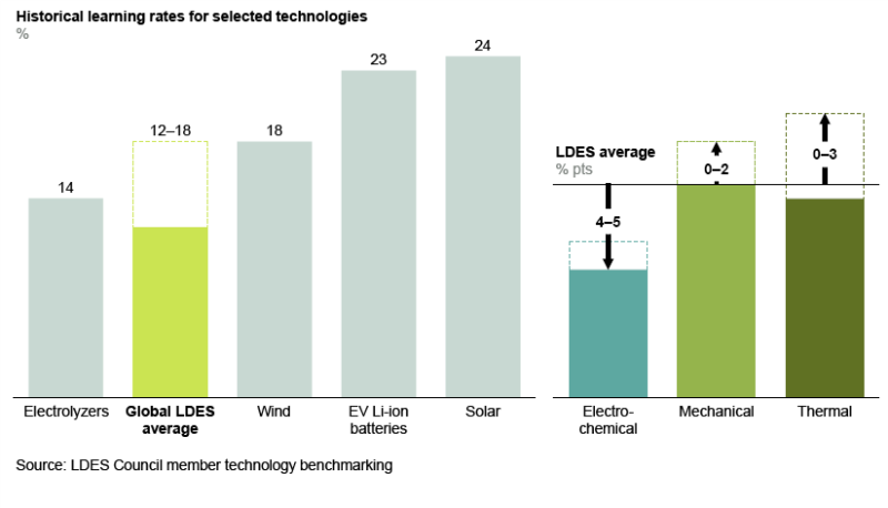 4、長時儲能系統(tǒng)的預(yù)計(jì)資本支出學(xué)習(xí)率與風(fēng)電、光伏和氫能等類似的突破性能源技術(shù)一致