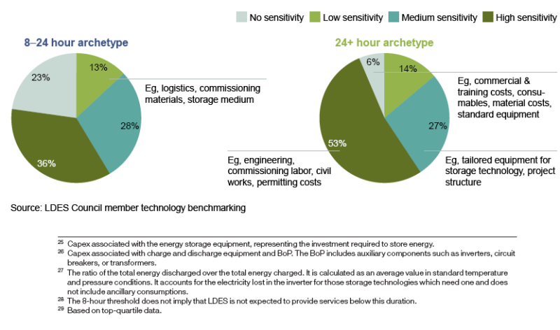 長時儲能顯示出技術(shù)學(xué)習(xí)率帶來的成本節(jié)約潛力。兩種長時儲能系統(tǒng)都對成本曲線很敏感,75%到90%的資本支出受到一定程度的影響(如圖21所示)。在8到24小時的長時儲能中,35%的資本支出容易受到成本曲線的影響。而隨著采購成本的影響降低,在24小時或更長時間的長時儲能中這一比例上升到50%以上。