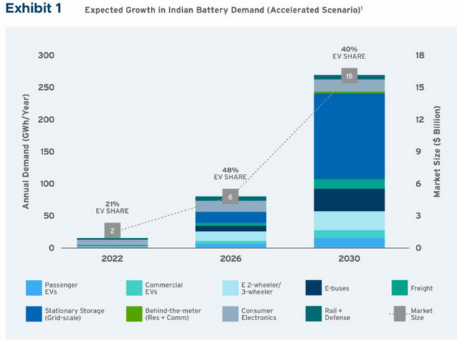 RMI和NITI Aayog在報告中提出了兩種方案,一種是保守方案,另一種是加速采用電池儲能系統(tǒng)。而在加速方案(260GWh)中,到2030年印度將有150億美元市場需求,其中30億美元用于電池儲能系統(tǒng),120億美元將用于生產(chǎn)電池。