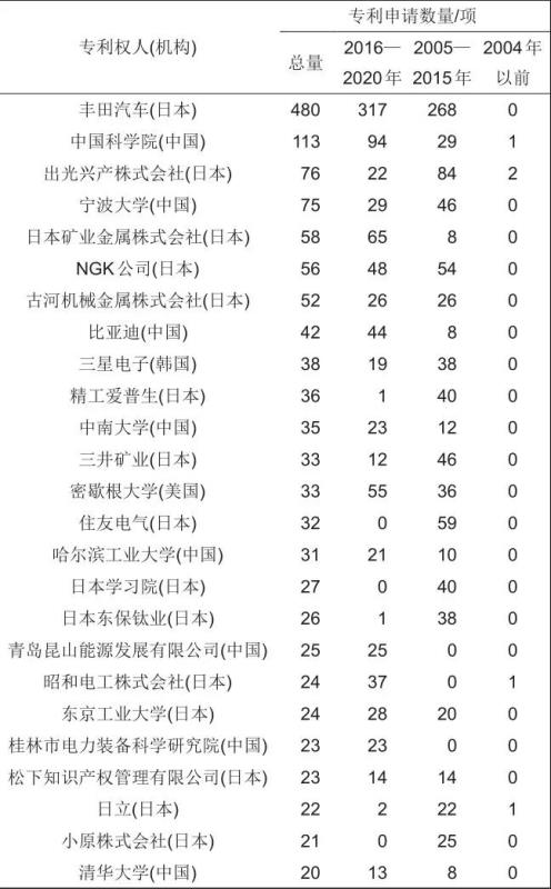 表3 全固態(tài)鋰電池技術(shù)專利權(quán)人(機構(gòu))及其專利申請時間分布情況