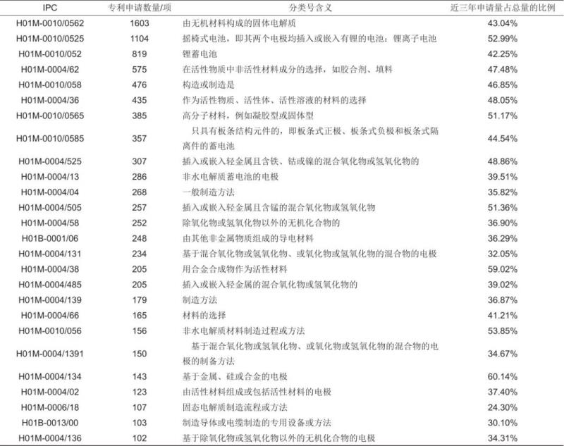 國際專利分類(IPC)是國際通用的、標準化的專利技術(shù)分類體系,蘊含著豐富的專利技術(shù)信息。通過對全固態(tài)鋰電池技術(shù)專利的IPC進行統(tǒng)計分析,可以準確、及時地獲取該領(lǐng)域涉及的主要技術(shù)主題和研發(fā)重點。本次分析的2841項專利中共涉及838個IPC分類號。全固態(tài)鋰電池技術(shù)專利申請量大于100項的IPC分類號及其申請情況(如表2所示),可以看出,分布式能源技術(shù)專利申請主要集中在以下方面。
