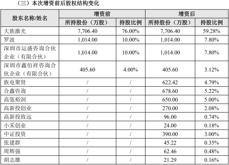 具體來看,高瓴裕潤擬對大族光電增資0.64億元、中證投資擬對大族光電增資0.38億元、高新投創(chuàng)業(yè)擬對大族光電增資0.27億元、高新投致遠擬對大族光電增資0.09億元、小禾創(chuàng)業(yè)擬對大族光電增資0.02億元。增資完成后,上述戰(zhàn)略投資人分別持有大族光電5%、3%、2.08%、0.74%、0.18%的股份。