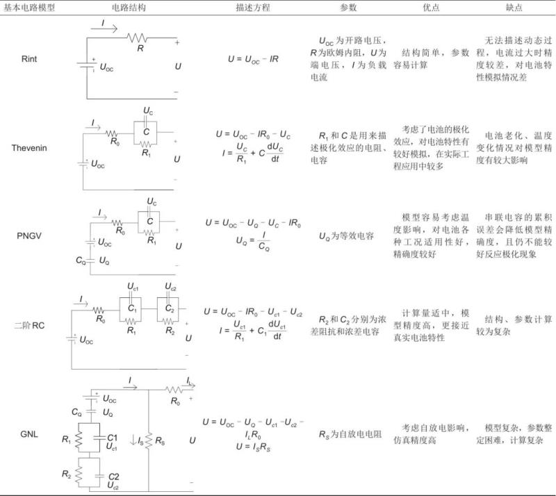 等效電路模型是將電池的各種外特性通過(guò)電路元件之間的組合來(lái)表示的一種模型。由于其清晰地給出了鋰離子電池各元素與U-I特性、荷電狀態(tài)之間的數(shù)學(xué)關(guān)系,所以被廣泛應(yīng)用。表1把幾種常用的電池模型進(jìn)行了比較。其中,文獻(xiàn)[15]的Rint模型由一個(gè)理想電壓源和歐姆內(nèi)阻構(gòu)成。結(jié)構(gòu)簡(jiǎn)單且參數(shù)容易計(jì)算,但是無(wú)法描述動(dòng)態(tài)過(guò)程。當(dāng)電池流過(guò)大電流時(shí),其仿真誤差增大,仿真精度大大降低。所以一般僅僅用來(lái)描述理想電池,在實(shí)際應(yīng)用中比較少。由于電池的電化學(xué)極化效應(yīng)會(huì)改變電池電極的電勢(shì),文獻(xiàn)[17]的Thevenin模型在上述基礎(chǔ)上添加一個(gè)RC結(jié)構(gòu)來(lái)模擬此效應(yīng),從而實(shí)現(xiàn)更高的精度。且其構(gòu)造相對(duì)簡(jiǎn)單,可以實(shí)現(xiàn)大部分的電池仿真,在現(xiàn)實(shí)中的應(yīng)用最廣泛。但是受到老化和溫度變化的影響較大,精確度一般。文獻(xiàn)[19]提出的PNGV模型比Thevenin模型多了一個(gè)電容圖片描述電流對(duì)OCV的影響,能夠?qū)崿F(xiàn)電池SOC、SOH等狀態(tài)的估計(jì)。但是串聯(lián)電容導(dǎo)致的累積誤差會(huì)降低模型的精確度。文獻(xiàn)[20-21]中介紹了由兩組RC與一個(gè)電阻串聯(lián)組成的二階RC模型,其將濃差極化的影響也考慮在內(nèi),所以仿真精度較高,特性更接近真實(shí)的電池。但是隨著元件的增多,結(jié)構(gòu)也更加復(fù)雜,且未考慮溫度的影響。文獻(xiàn)[23]中的GNL模型在二階RC模型的基礎(chǔ)上,增加了一個(gè)電阻圖片來(lái)模擬電池的自放電特性。模型的精度更高,適用性更好,但是模型的建立和參數(shù)的計(jì)算更加復(fù)雜。