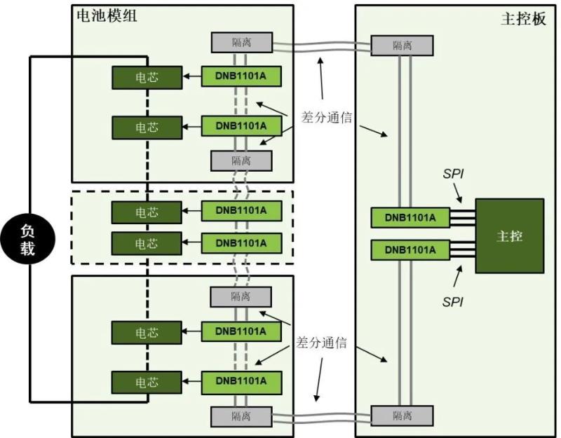 DNB1101A為每個單獨的電芯或并聯(lián)的一組電芯提供多種傳感功能,包括電壓監(jiān)測、溫度監(jiān)測和電化學(xué)阻抗譜(EIS)監(jiān)測。通過差分菊花鏈,電池參數(shù)信息被傳輸?shù)诫姵亟M控制器。鏈中的第一顆芯片將標(biāo)準(zhǔn)SPI信號轉(zhuǎn)換為菊花鏈差分信號,反之亦然。芯片支持環(huán)形通信架構(gòu)。