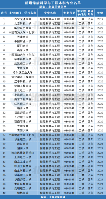 2020年1月,教育部、國家發(fā)展改革委、國家能源局聯(lián)合發(fā)布了《儲能技術專業(yè)學科發(fā)展行動計劃(2020—2024年)》,計劃經(jīng)過5年左右努力,增設若干儲能技術本科專業(yè)、二級學科和交叉學科,完善儲能技術人才培養(yǎng)專業(yè)學科體系,在京津冀、東北、長江經(jīng)濟帶、長三角、西北等地區(qū)布局建設儲能技術、儲能材料、儲能管理等新專業(yè)。隨后,教育部2019年度普通高等學校本科專業(yè)備案和審批中首次設立“儲能科學工程”新專業(yè)、專業(yè)代碼080504T(T代表特設專業(yè)),當年僅有西安交通大學增設了該專業(yè)。2021年3月1日,在2020年度本科專業(yè)備案和審批中,又有北京科技大學、華北電力大學、中國石油大學、華中科技大學、武漢理工大學、哈爾濱工業(yè)大學、東北電力大學、福建師范大學、長沙理工大學、青海大學等等共25所高校增設了“儲能科學與工程”專業(yè)。截至目前,設置儲能專業(yè)的院校共計達到40所!