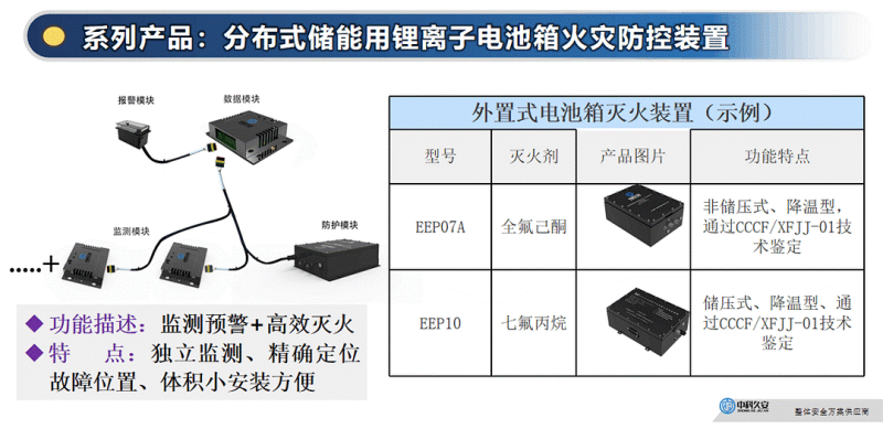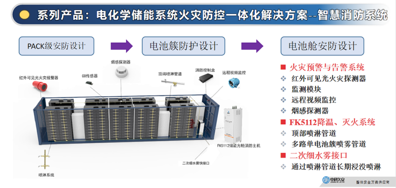 該系統(tǒng)廣泛應(yīng)用于集裝箱式電化學(xué)儲能系統(tǒng)、建筑內(nèi)電化學(xué)儲能系統(tǒng)、通訊塔/站的UPS電源儲能系統(tǒng)、工業(yè)UPS電源系統(tǒng)、電動船舶、新能源車輛等場景,為行業(yè)內(nèi)客戶提供一站式消防安全解決方案。