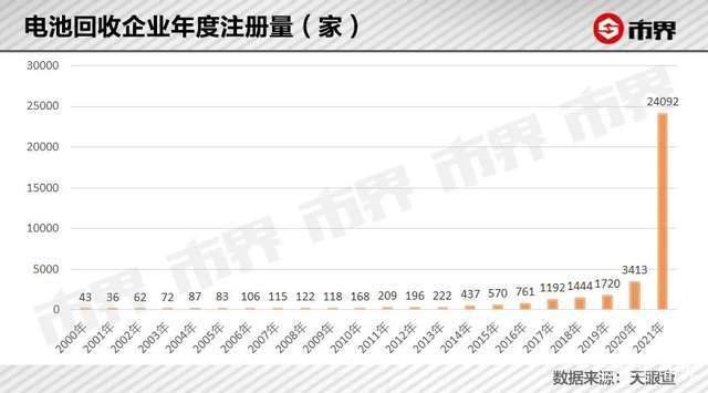 天眼查數(shù)據(jù)顯示,2011年,即第一批電動(dòng)汽車投放市場(chǎng)的那一年,與電池回收相關(guān)的企業(yè)注冊(cè)量首次突破200家,2017年首次突破1000家。