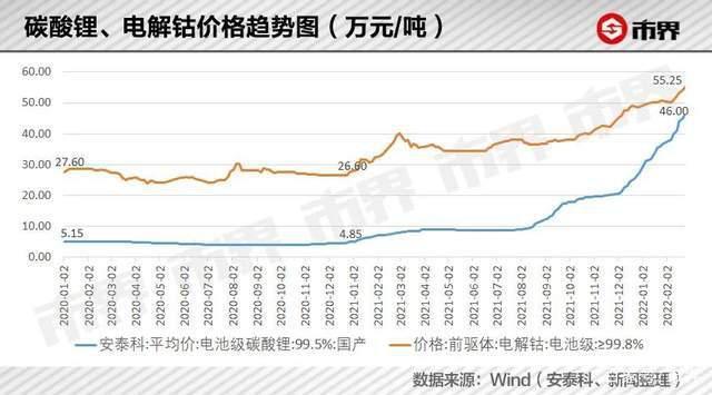 Wind數(shù)據(jù)顯示,電池級(jí)碳酸鋰價(jià)格已經(jīng)從2021年初近5萬元/噸漲至2022年2月24日的46萬元/噸,電解鈷價(jià)格則從27萬元/噸增至55.25萬元/噸。
