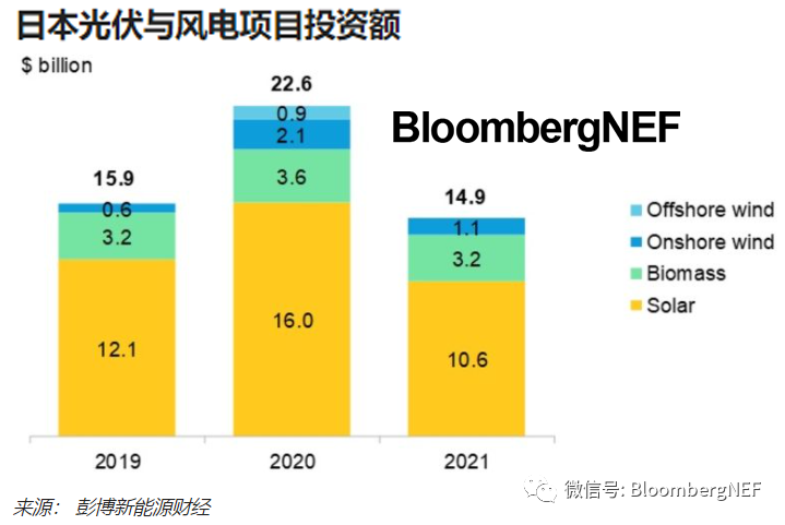 彭博新能源財經(jīng)估計,2021年日本光伏、風(fēng)電和生物質(zhì)市場投資額總計149億美元,比2020年下降34%??稍偕茉囱a(bǔ)貼一直下降,而成本保持高位,從而對日本清潔能源發(fā)展構(gòu)成較大障礙。