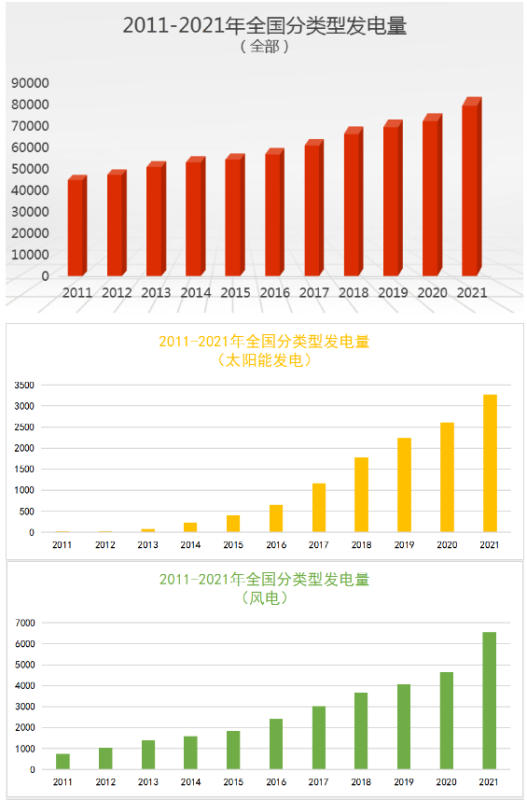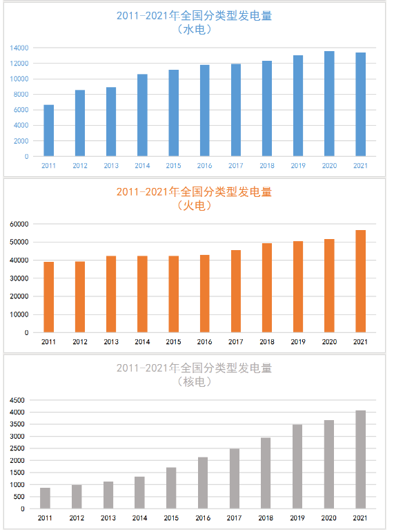 以下是2011-2021年全國(guó)各類(lèi)型發(fā)電量情況。