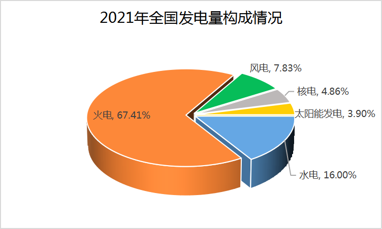 2021年全國(guó)水電、火電、核電、風(fēng)電、光伏發(fā)電的發(fā)電量分別為13401、56463、4075、6556和3270億千瓦時(shí),合計(jì)83768億千瓦時(shí)。