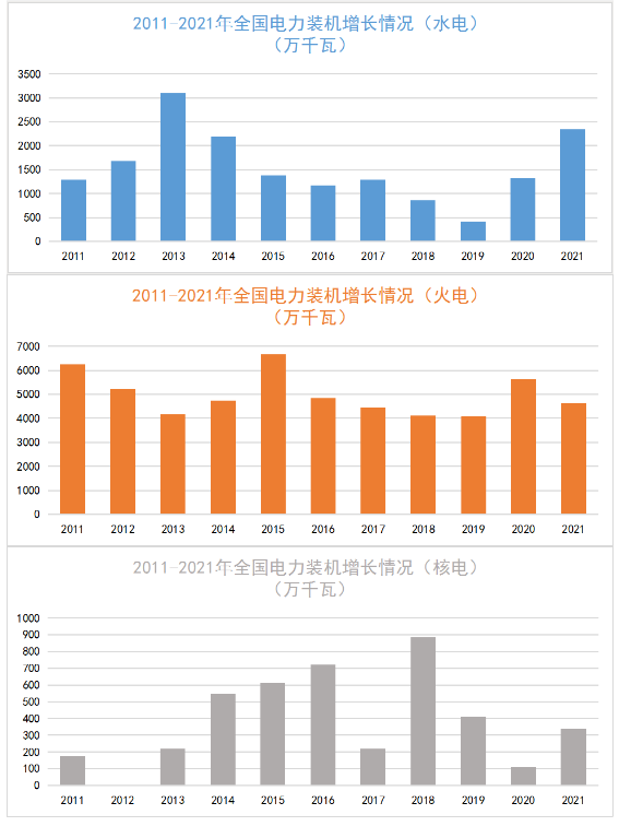 一、2011~2021年各類(lèi)電源新增裝機(jī)情況